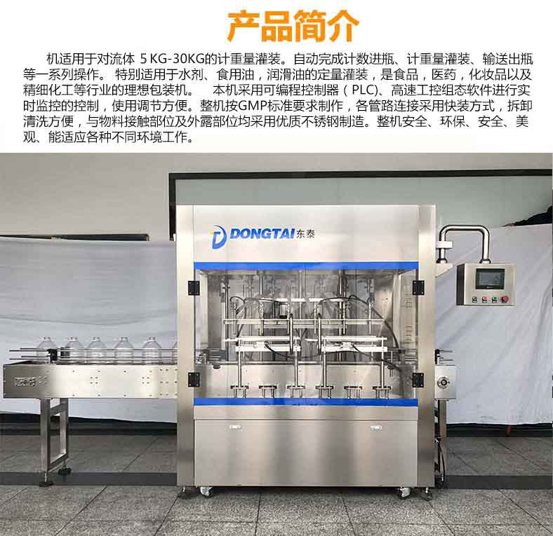 本機適用于對流體5kg-30kg的計重量灌裝。自動完成計數(shù)進瓶、計重量灌裝、輸送出瓶等一系列操作。 特別適用于水劑、食用油,潤滑油的定量灌裝,是食品,醫(yī)藥,化妝品以及精細化工等行業(yè)的包裝機。本機采用可編程控制器(PLC)、高速工控組態(tài)軟件進行實時監(jiān)控的控制,使用調(diào)節(jié)方便。整機按GMP標準要求制作,各管路連接采用快裝方式,拆卸清洗方便,與物料接觸部位及外露部位均采用優(yōu)質(zhì)不銹鋼制造。整機安全、環(huán)保、安全、美觀、能適應各種不同環(huán)境工作。