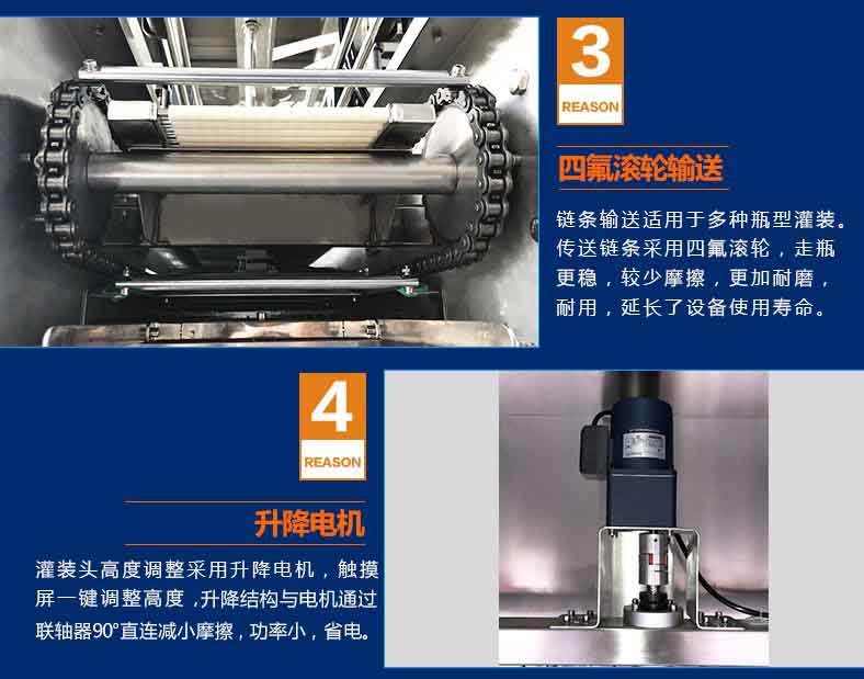 2、鏈條輸送適用于多種瓶型灌裝。傳送鏈條采用四氟滾輪,走瓶更穩(wěn),較少摩擦,更加耐磨,耐用,延長了設備使用壽命。增加卡瓶口裝置:方便瓶口小的容器灌裝,灌裝頭和瓶口的定位更準確;采用O型擋板,屏蔽漲緊輪的弊端(采用魚眼調(diào)節(jié)鏈輪的松緊度),輸送采用四氟滾輪式,容器輸送更平穩(wěn),可正反轉(zhuǎn)輸送;