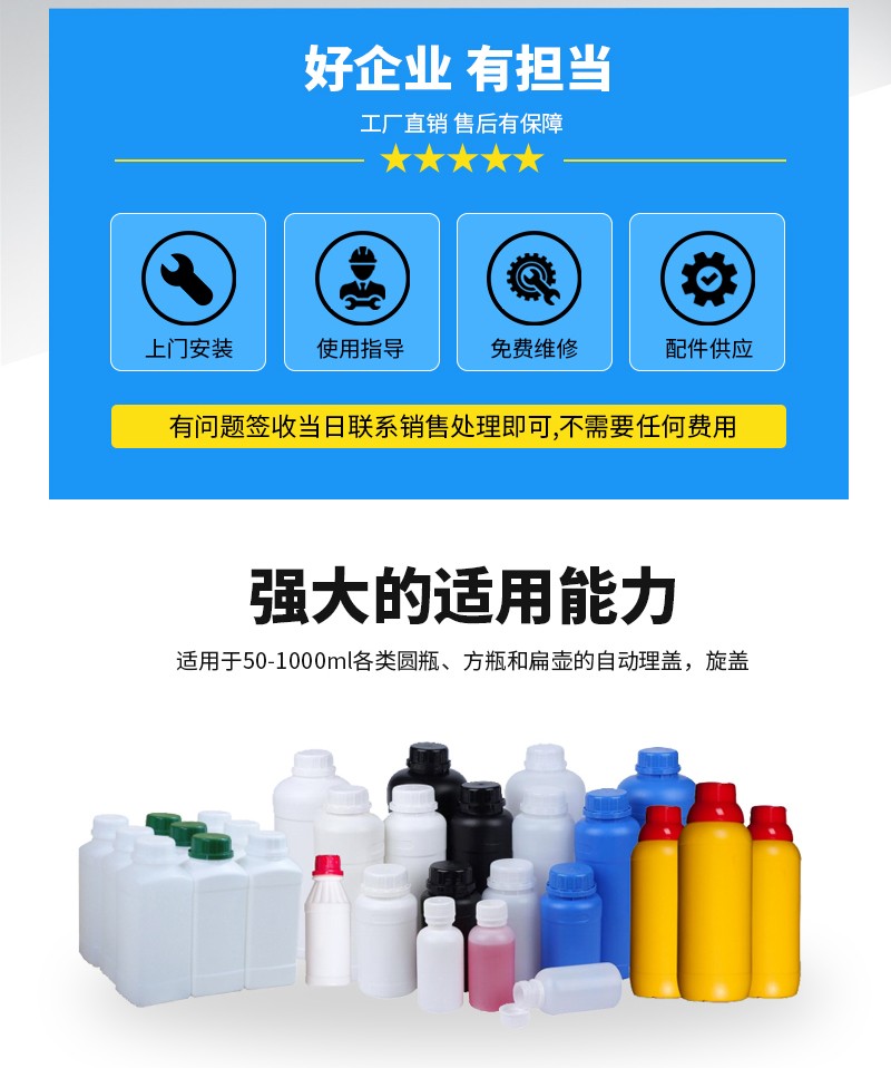 1、通用性強(qiáng):適用于50-1000ml各類圓瓶、方瓶和扁壺的自動理蓋,旋蓋;